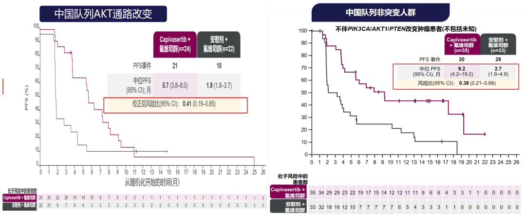 胡夕春教授:我们从CAPItello-291试验的中国数据中可以看到一些有趣的结果。在全球试验中,我们招募了24例患者,在扩展队列中,我们招募了110例患者。对于携带PAM通路信号改变的中国患者,HR仅为0.41;而对于非PAM通路改变的患者,HR低至0.38。Elgene Lim教授,您会如何看待这一现象?