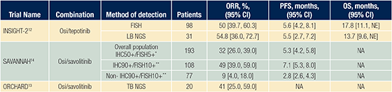 MET失调(包括METamp)是奥希替尼耐药的最常见机制,约占病例的25%[10]。临床数据表明,获得性METamp是耐药的早期事件[11]。当METamp发生在第三代TKI治疗进展时,与单独使用MET抑制剂相比,双重抑制EGFR/MET似乎是更好的方法[12]。I/II期临床试验显示MET-TKI+奥希替尼联合方案的总体缓解率(ORR)高达50%,中位PFS为5.0个月(表格)[12-14]。SAFFRON(NCT05261399)等验证性III期试验正在对奥希替尼+MET-TKI和铂类/培美曲塞化疗进行比较,评估类似方案的另一项III期试验GEOMETRY-E(NCT04816214)招募工作被暂停。