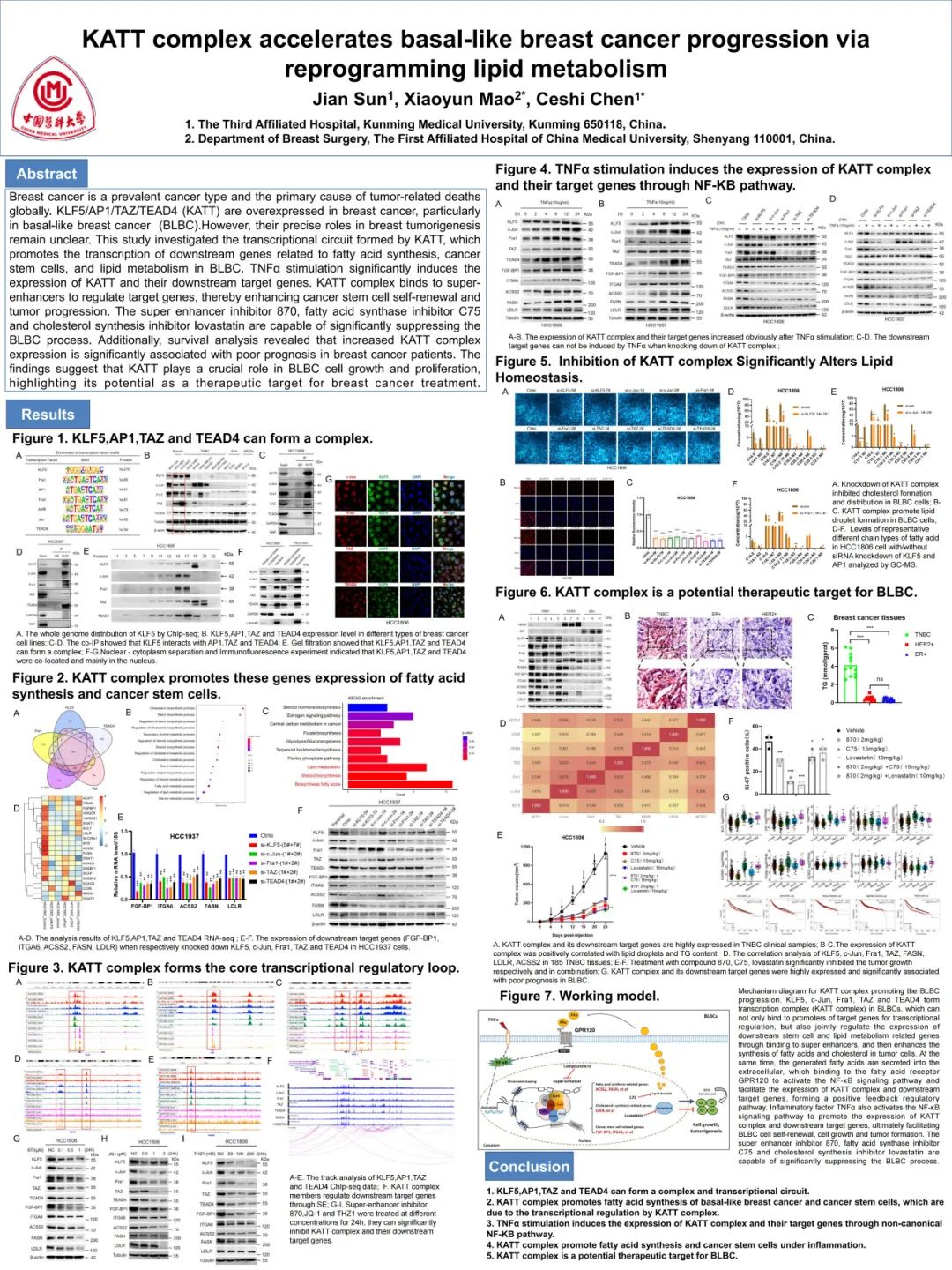 该研究发现KLF5、AP1、TAZ和TEAD4在三阴性乳腺癌中,尤其BLBC中高表达状态,它们通过形成一个复杂的转录复合物——KATT复合物来调节与干细胞和脂质代谢相关的下游基因转录。这一发现不仅为我们理解乳腺癌的脂质代谢异常提供了新的视角,也揭示了KATT复合物在促进脂质合成和肿瘤干细胞自我更新方面的重要作用,KATT复合物成员之间还通过超级增强子相互调控形成了一个核心调控环,这为我们深入理解乳腺癌的复杂调控网络提供了新的线索。