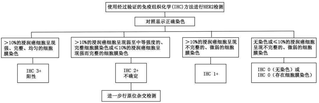 中国《乳腺癌HER2检测指南(2024版)》[8]中规定,若HER2 IHC结果为0,当≤10%的浸润癌细胞呈现不完整的、微弱的细胞膜染色时属于“HER2超低表达”,并建议具体报告为“HER2 IHC 0(存在细胞膜染色)”,从而为临床医生提供精准的诊断意见和治疗决策依据。中国《乳腺癌HER2检测指南(2024版)》还进一步明确了HER2检测及判读流程,并重点明确了IHC 0时对“无染色”和“存在细胞膜染色”的区分,为临床实践提供了紧跟进展且可行性强的指导意见。