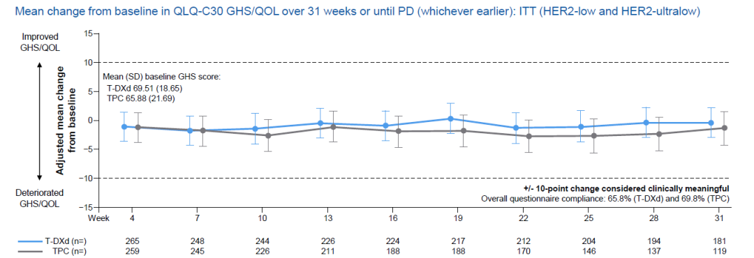 OS虽尚不成熟,但T-DXd在ITT人群、HER2-low、HER2-Ultralow人群也初步展现了获益趋势。在安全性方面,该研究T-DXd安全性特征与既往一致,未见新的安全信号[3]。在生活质量方面,2024年欧洲肿瘤内科学会年会(ESMO)公布的患者报告结局(PRO)数据显示,在ITT人群中,T-DXd与TPC相比,QLQ-C30全身健康状况/生活质量(GHS/QOL)评分较基线变化均值呈现更好的趋势,从而保障了患者生活质量[4]。
