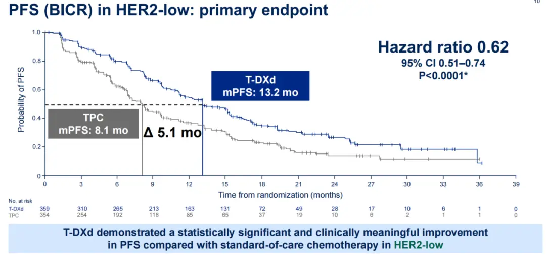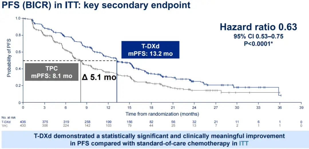 该研究共纳入866例患者,其中HER2-low 713例,HER2-Ultralow 153例。按1:1予以T-DXd和TPC组治疗。在2024年美国临床肿瘤学会(ASCO)年会发布了主要研究结果,中位随访时间为18.2个月显示:T-DXd组与TPC组经BICR评估的mPFS在HR+/HER2-low人群中为13.2个月vs 8.1个月,HR=0.62(95%CI 0.51-0.74),P<0.0001;