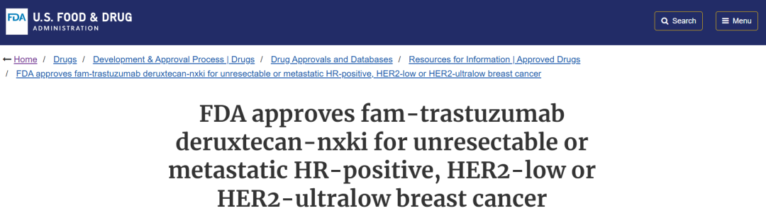 2025年1月27日,FDA批准T-DXd用于治疗在转移阶段经过一种或以上内分泌治疗后进展的,由FDA批准的检测手段确定的HR+,且为HER2-low或HER2-ultralow的不可切除或转移性成人乳腺癌患者[2]。