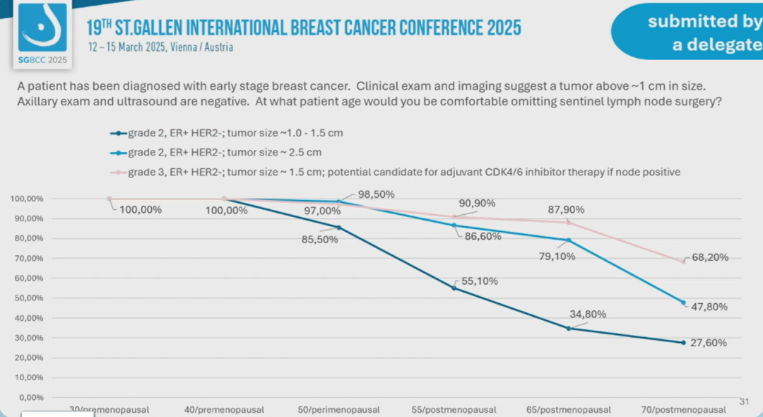 (4)某患者诊断为早期乳腺癌。临床查体和影像学提示肿瘤大小约超过1cm。腋窝检查和超声均为阴性。患者在什么年龄下,您会考虑豁免前哨淋巴结手术?