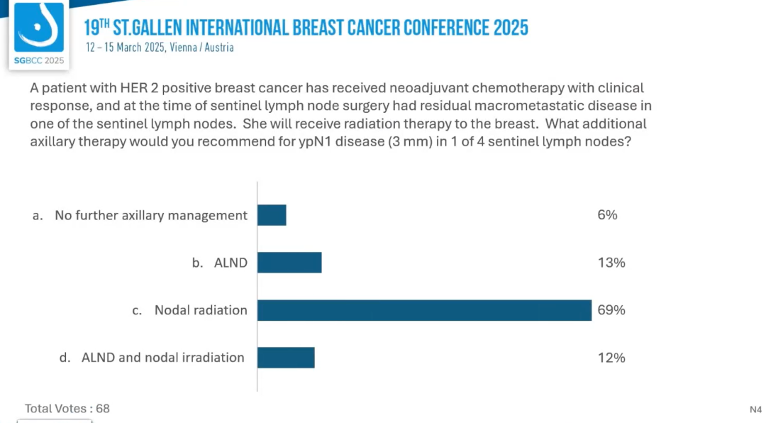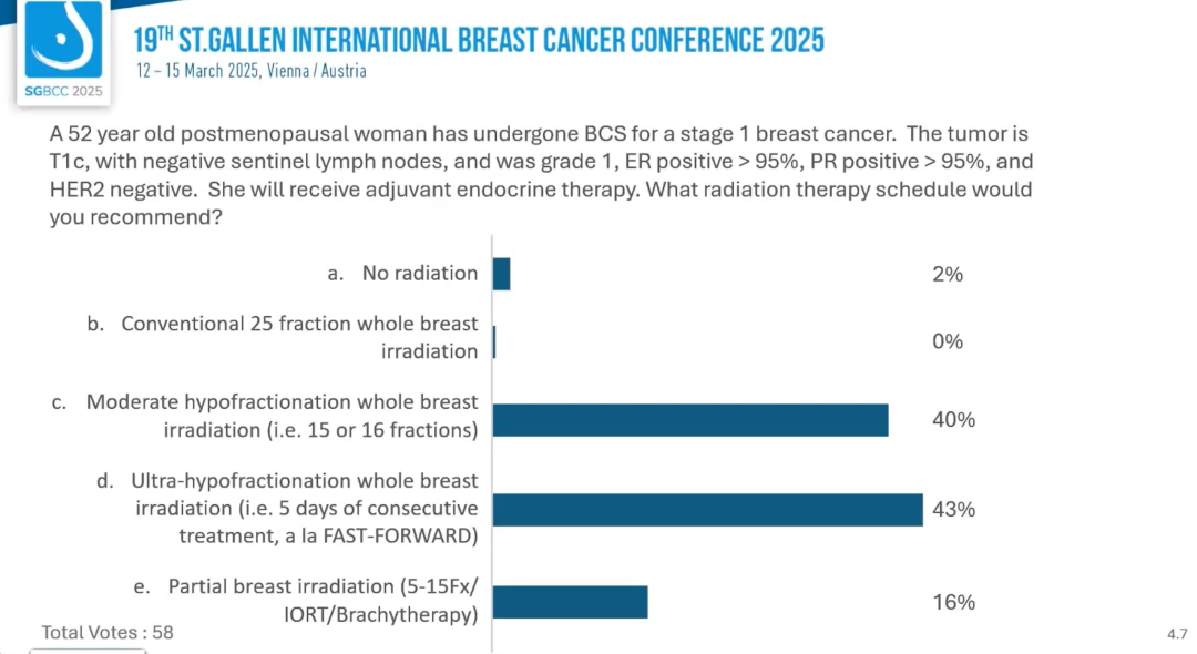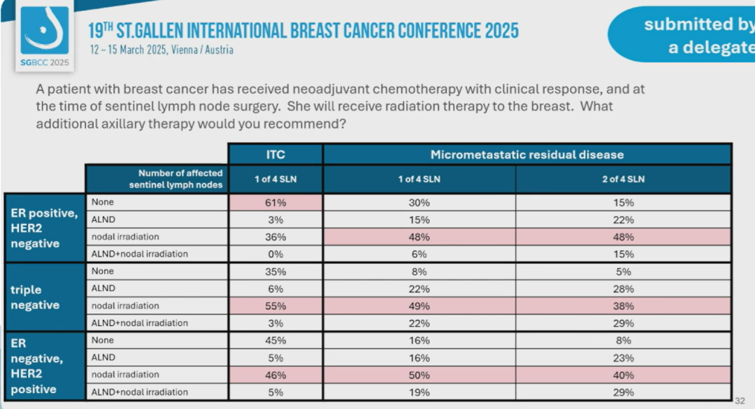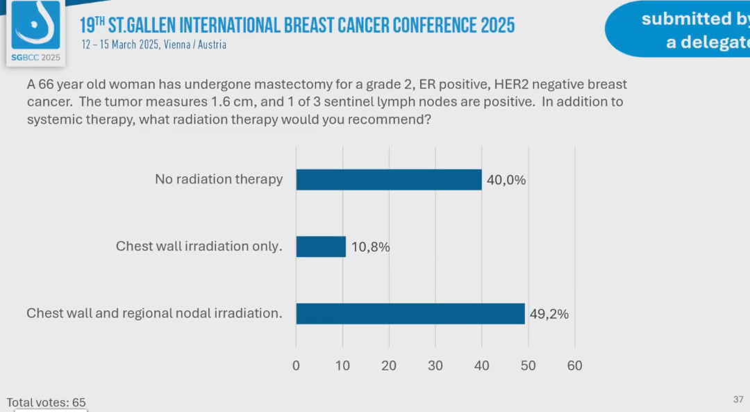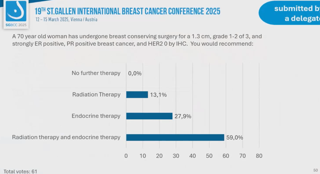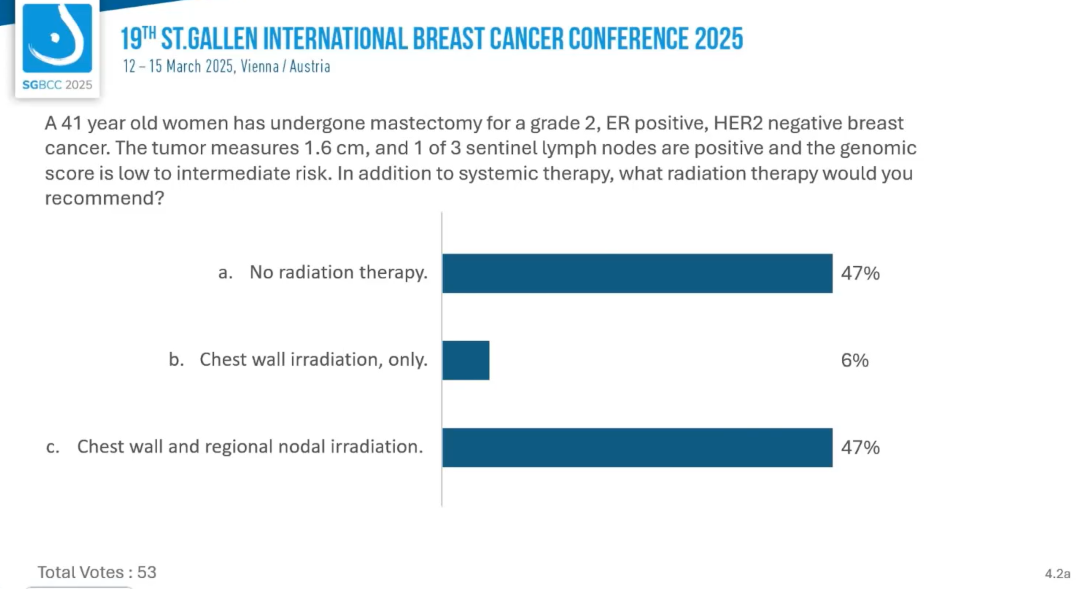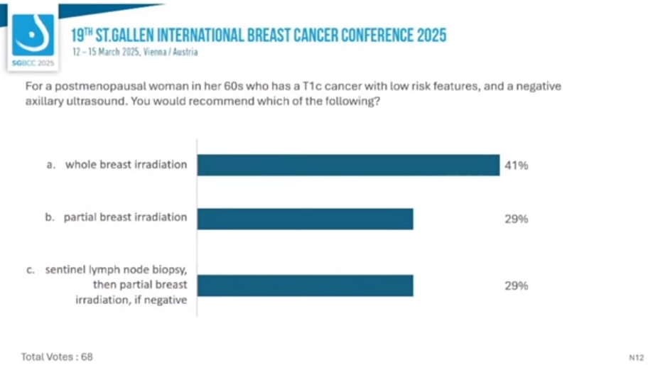 编者按:第19届St.Gallen国际乳腺癌大会(SGBCC 2025)于当地时间2025年3月12~15日在音乐之都维也纳举行。大会的最后一天,专家投票压轴登场。《肿瘤瞭望》整理了保乳和腋窝处理章节、放疗章节的专家投票,现成文如下,与大家一起感受早期乳腺癌治疗决策的圣加伦氛围。