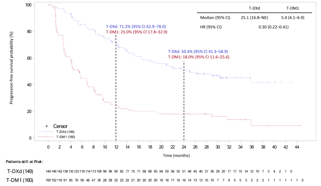 至数据截止日期(2022年7月25日),T-DXd组中位随访时间为29.0个月,T-DM1组中位随访时间为26.0个月。结果显示,T-DXd组与T-DM1组由盲法独立中心审查(BICR)评估的mPFS为25.1个月vs 5.4个月(HR=0.30;95%CI:0.22~0.41);12个月PFS率为71.2%vs 25.0%,24个月PFS率为50.4%和18.0%。