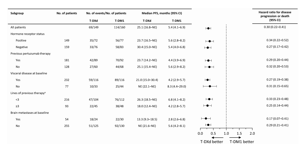 T-DXd组与T-DM1组研究者评估的mPFS为26.3个月vs 7.0个月(HR 0.30;95%CI:0.22~0.41)。在激素受体状态、既往帕妥珠单抗治疗、基线内脏转移、既往治疗线数和基线脑转移等亚组中,均观察到了T-DXd一致的PFS获益。