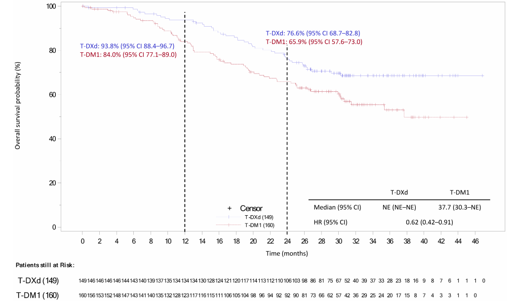 T-DXd组与T-DM1组mOS未达到(95%CI:NE~NE)vs 37.7个月(95%CI:30.3~NE)(HR=0.62;95%CI 0.42~0.91);两组12个月OS率为93.8%vs 84.0%,24个月OS率为76.6%vs 65.9%。