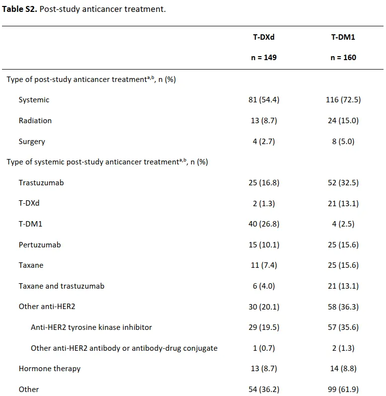 后续治疗方面,研究期间T-DXd组和T-DM1组分别有76.2%和93.7%的患者中止治疗,治疗完成后,分别有54.4%和72.5%的患者接受新的系统治疗,至数据截止时,T-DXd组与T-DM1组分别有22.8%和34.3%的患者在后续系统治疗中出现疾病进展(PD)。研究者评估的从随机化到下一线治疗首次记录到疾病进展的mPFS2在T-DXd组和T-DM1组分别为41.2个月vs 19.6个月(HR=0.46;95%CI:0.32~0.65)。