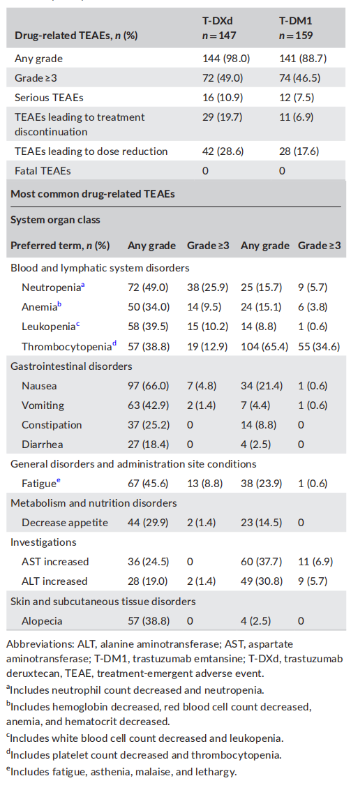 安全性方面,T-DXd的中位治疗持续时间为15.4个月(范围0.7~44.0),T-DM1为5.5个月(0.7~39.3)。对T-DXd组147例患者和T-DM1组159例患者的安全性评估显示,药物相关的≥3级治疗相关不良事件(TEAE)发生率为49.0%vs 46.5%,药物相关的严重TEAE为10.9%vs 7.5%,未见药物相关TEAE导致的死亡。T-DXd最常见的≥3级药物相关TEAE为中性粒细胞减少(25.9%)、血小板减少(12.9%)、白细胞减少(10.2%)、贫血(9.5%)和疲劳(8.8%);T-DM1最常见的≥3级药物相关TEAE则为血小板减少(34.6%)、天冬氨酸氨基转移酶升高(6.9%)、丙氨酸氨基转移酶升高(5.7%)和中性粒细胞减少(5.7%)。