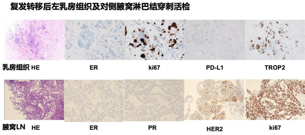 乳腺组织穿刺,病理:乳腺浸润性癌。IHC:ER(-),HER-2浸润癌(1+),Ki-67热点区约80%(+),PD-L1(22C3)CPS为5,TROP2约90%中-强(+),E-Cadherin(+),P120膜(+),CK5/6(-),P63(-),Calponin(-),SMMHC(-),EGFR约80%中-强(+),TRPS1(+)。