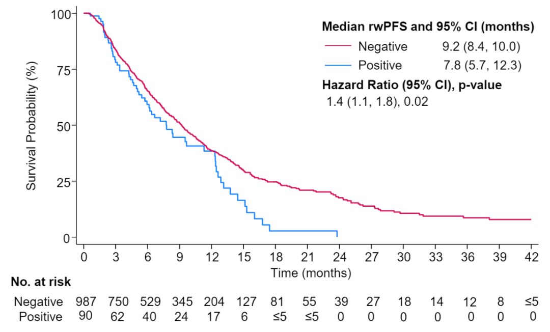 在149例有PD-L1状态信息的患者中,18例(12.0%)为PD-L1阳性(22C3方法评估:CPS≥10)。与PD-L1阴性患者相比,PD-L1阳性患者的rwPFS(12.6 vs 6.9个月,HR 0.7,P=0.31)和OS(NR vs 14.7个月,HR 0.5,P=0.18)在数值上更长,尽管没有显著统计学意义。