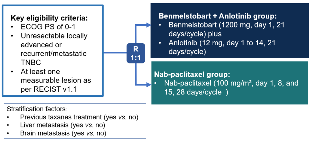 研究方法:本试验计划纳入332例患者,2020年7月首例入组,但由于入组困难等客观因素,最终于2023年1月终止招募。本项临床试验中,既往未接受过治疗的IV期或复发性/转移性TNBC患者按1:1比例随机分组。试验组患者在第1天静脉注射1200 mg贝莫苏拜单抗,并在第1至14天口服12 mg安罗替尼,每3周为一个周期。对照组患者在每4周的第1、8、15天静脉注射100 mg/m²白蛋白紫杉醇。随机分组依据患者是否曾接受新辅助或辅助紫杉类药物治疗,以及基线时是否存在肝或脑转移进行分层。主要终点为无进展生存期(PFS),由盲态独立中心评估委员会根据RECIST 1.1标准进行评估(图1)。