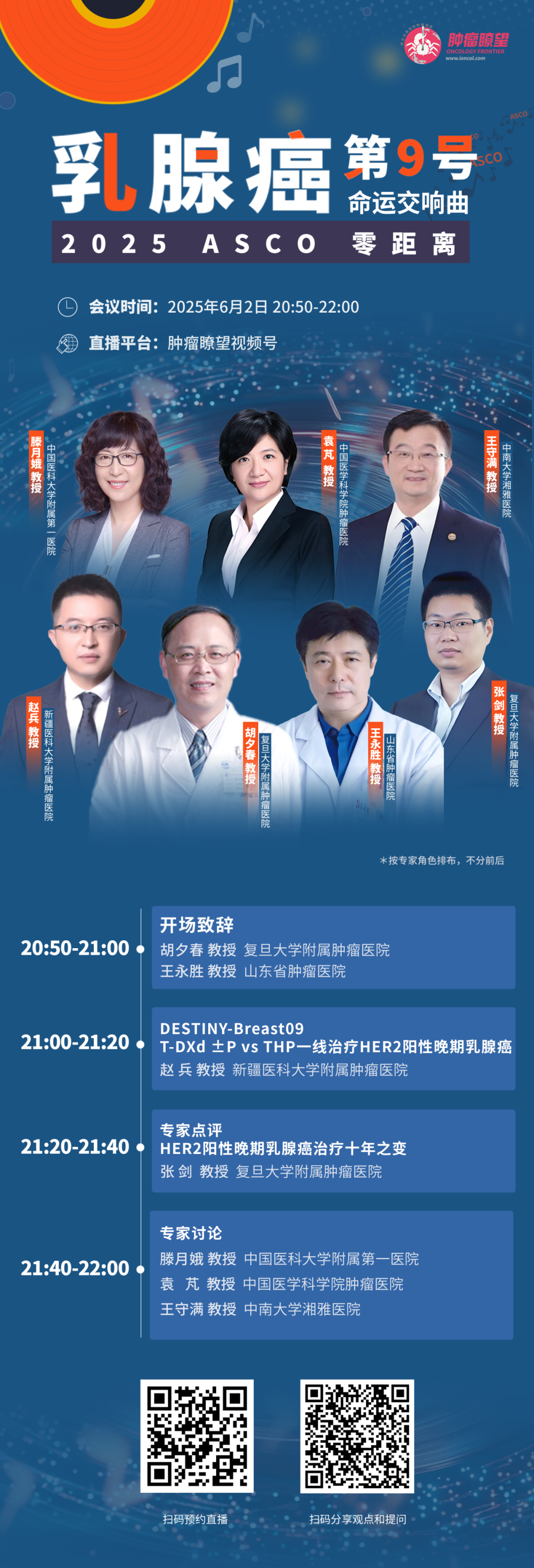 为让国内专家第一时间深度了解该研究发布数据,我们特别推出“乳腺癌第9号命运交响曲•ASCO零距离”活动,在美国ASCO年会上公布后,第一时间组织乳腺癌领域专家对数据进行解读。与权威专家齐聚一堂,共同见证乳腺癌领域又一个划时代意义研究数据的发布!