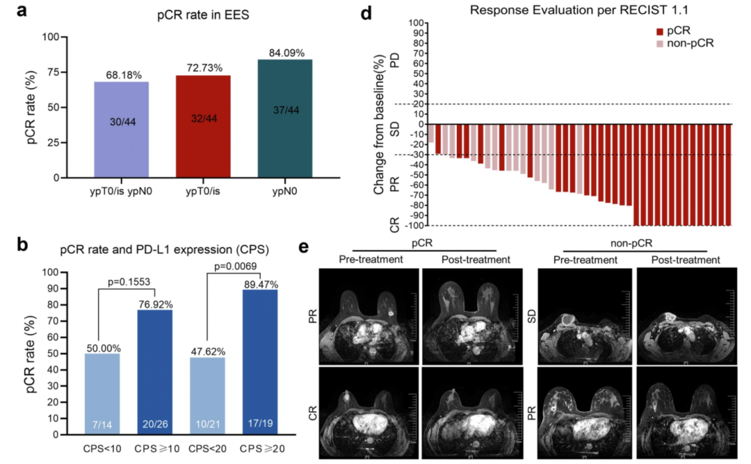 在44例可评估疗效的患者中,30例(68.18%)达到了pCR,其中14例(31.82%)达到了完全缓解(CR),ORR为93.18%,显示出显著的疗效。此外,研究还观察到,高PD-L1表达水平与更好的病理反应相关,PD-L1 CPS≥20组pCR率达89.47%(见下图b)。
