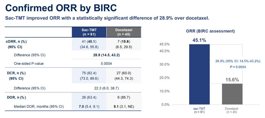 在肿瘤缓解方面,经BIRC评估,芦康沙妥珠单抗组的ORR为45.1%,相较于多西他赛组(15.6%),显著提高28.9%,达到了该研究的主要终点。而且,无论TROP2表达水平如何,芦康沙妥珠单抗组的ORR获益均显著优于多西他赛组。