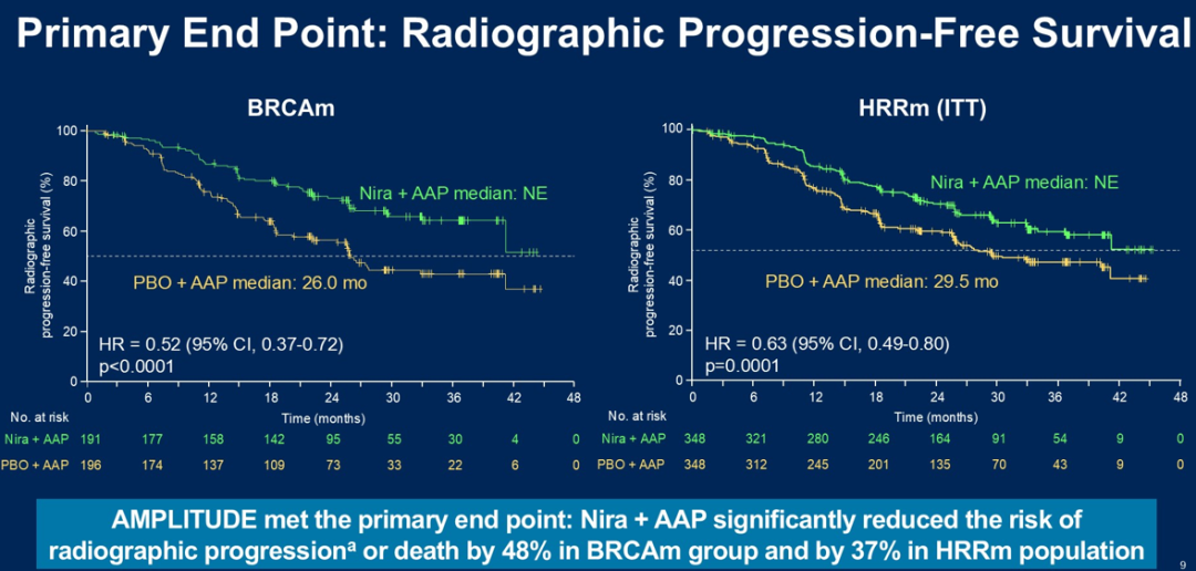 在整个研究人群中,与安慰剂加AAP相比,尼拉帕利加AAP组放射学进展或死亡的风险降低了37%(HR 0.63,95%CI 0.49-0.80;P=0.0001)。