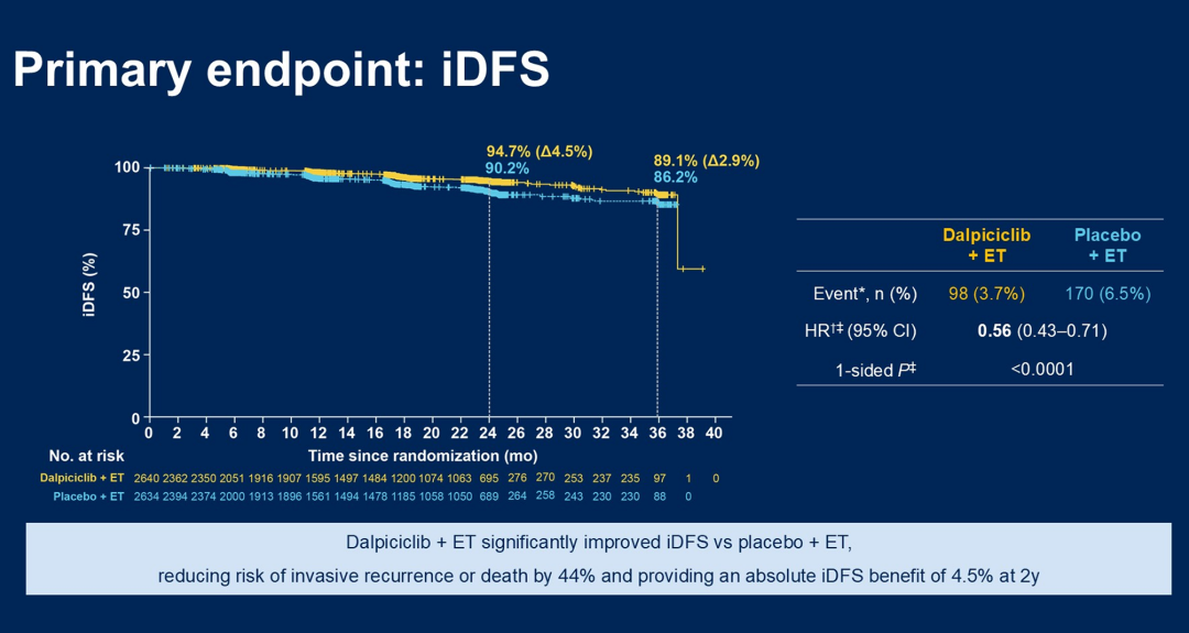刘真真教授:首先祝贺DAWNA-A研究取得了非常好的结果。此次ASCO大会上,DAWNA-A研究报告了中国原创CDK4/6i达尔西利在高危患者中强化辅助治疗的两年数据,其疗效数据非常出色。达尔西利组的2年无浸润性病生存期(iDFS)相较于对照组提高4.5%(94.7%vs 90.2%;HR 0.56,95%CI:0.43~0.71,P<0.0001),而且在无病生存期(DFS HR 0.53,2年提高5.2%)和无远处转移生存期(DDFS HR 0.60,2年提高3.8%)也显示达尔西利组获益。