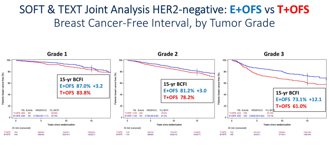 此次报道SOFT/TEXT联合分析的15年数据显示,总体而言,OFS+AI、OFS+TAM联合治疗优于TAM单药治疗。这些结果与临床实践相符。尤其在需要化疗的复发高危患者中,包括年轻(<35岁)、组织学3级等恶性程度往往较高的肿瘤中,OFS+AI显示了持续生存获益。15年的随访结果进一步坚定了我们在临床中使用这种治疗策略的信心。