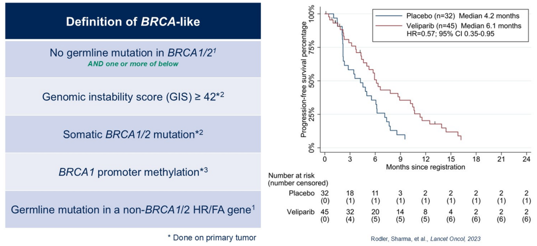 SWOG S1416研究则探索了维利帕利(Veliparib),其创新之处是将治疗人群扩大至BRCA样(BRCA-like)表型的乳腺癌患者,包括非gBRCA突变、基因不稳定性(GSI)评分≥42、sBRCA突变、BRCA1启动子甲基化、非BRCA1/2 HR/FA基因胚系突变;这种BRCA-like表型的患者在mTNBC中的比例可达40%~60%。既往报道显示BRCA-like且接受过≤1线治疗的mTNBC患者,使用维利帕利联合顺铂治疗可相较于顺铂延长PFS(6.2 vs 4.2个月,HR 0.57)。中位6.2个月的PFS对于mTNBC后线治疗而言是一个非常不错的结果。