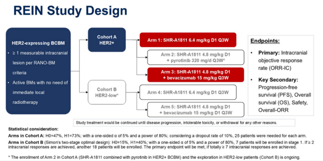 在今年ASCO大会上,国产新型ADC类药物SHR-A1811在脑转移患者中也展现出了良好疗效。在闫敏教授开展的REIN研究(摘要号:1017)中,将HER2阳性脑转移乳腺癌患者随机分为三组:SHR-A1811单药组(Arm 1)、SHR-A1811联合吡咯替尼组(Arm 2)以及SHR-A1811联合贝伐珠单抗组(Arm 3)。