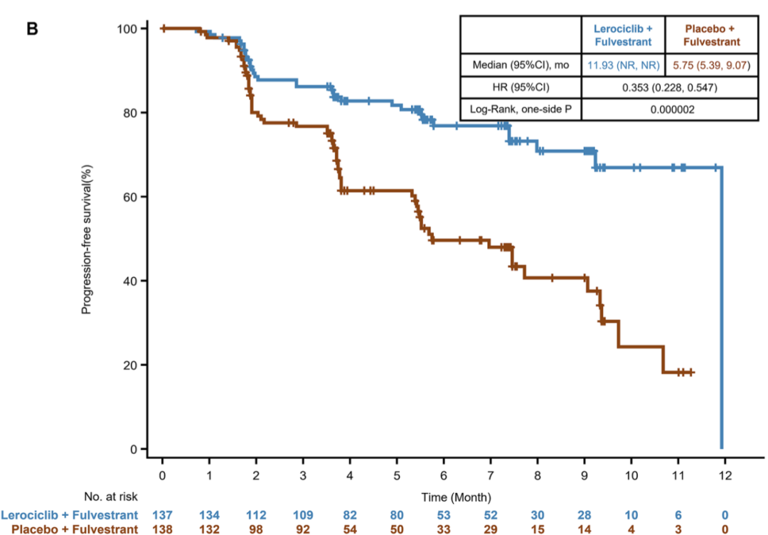 徐兵河院士牵头的LEONARDA-1研究入组了既往接受过内分泌治疗后进展的HR+/HER2-乳腺癌患者,共276例,按1:1分组予以来罗西利+氟维司群对比安慰剂+氟维司群。结果显示,研究者评估的中位无进展生存期(PFS)取得显著改善,为11.07个月vs 5.49个月,HR为0.451,P<0.0001。HR更具优势,为更多患者带来获益,且安全性更优,获得广泛认可[2]。