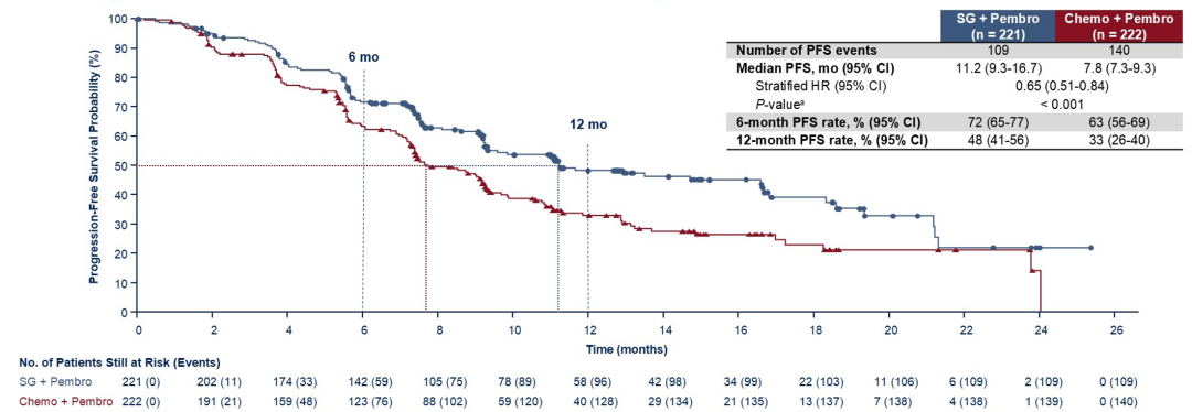 江泽飞教授:虽然我们没有到ASCO现场,但我非常有幸第一时间在线上与该研究的全球Leading PI——来自丹娜-法伯癌症研究所的Sara M.Tolaney教授进行交流和解读。这项全球多中心III期临床研究纳入了包括初诊和早期治疗复发的,以及少数经过PD-(L)1免疫治疗的患者,非常符合当前的临床实践。研究结果显示,新型TROP2 ADC戈沙妥珠单抗(SG)联合免疫治疗,能够相较于化疗联合免疫治疗显著改善患者的无进展生存期(BICR评估的PFS:11.2 vs 7.8个月,HR 0.65,95%CI:0.51-0.84,P<0.001)。