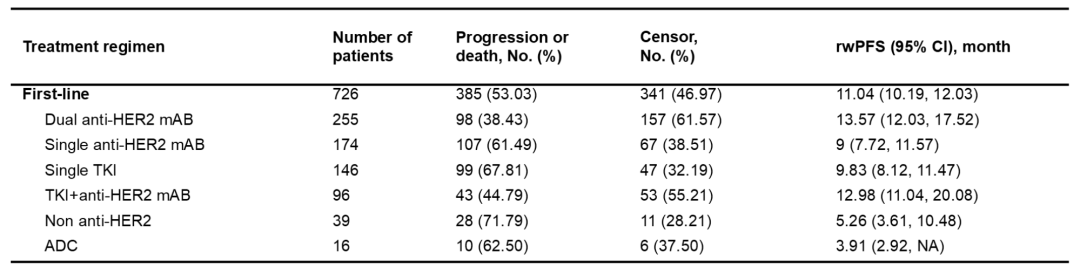 一线和二线治疗的中位真实世界无进展生存期(rwPFS)分别为11.04个月(95%CI:10.19-12.03)(图4)和7.59个月(95%CI:6.21-9.2)。在一线治疗的方案中,mAB双靶治疗患者的中位rwPFS最长,为13.57个月(95%CI:12.03-17.52),其次是TKI+mAB单靶治疗,中位rwPFS为12.98个月(95%CI:11.04-20.08)(图4,表1)。在一线接受曲帕双靶而二线转换为单药TKI治疗的患者中,观察到最长的中位rwPFS2(24.32个月),尽管样本量较小。