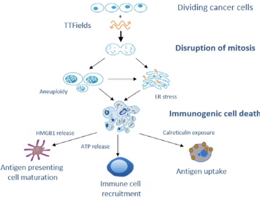 除了与化疗联合外,TTFields与免疫治疗也具有协同机制。TTFields可通过低强度交变电场破坏微管聚合,干扰癌细胞有丝分裂,诱导肿瘤子代细胞染色体非整倍体化,促使肿瘤细胞进入应激状态,导致免疫原性死亡,从而显著提升全身的抗肿瘤反应(图8)[11,12]。该机制已在动物肺癌模型中获初步验证,显示TTFields治疗后肿瘤免疫浸润显著增加[13],确证了TTFields增强肿瘤免疫原性的特点,从而为其他肿瘤如胰腺癌等的免疫疗法提供了新的策略方向。