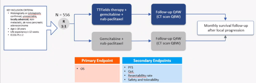 基于PANOVA研究结果,Teresa Macarulla Mercade教授启动了前瞻性、开放标签、国际多中心、Ⅲ期随机对照试验——PANOVA-3研究[8],旨在进一步验证TTFields联合化疗在晚期胰腺癌中的疗效及安全性。该研究纳入556例局部晚期、非转移性、未经治疗的胰腺癌患者,按1:1的比例随机分组,TTFields联合吉西他滨及白蛋白紫杉醇作为干预组,吉西他滨/白蛋白紫杉醇作为对照组(图4)。主要评估指标是OS,次要评估指标是PFS、生活质量和肿瘤切除率以及药物的安全性和耐受性。