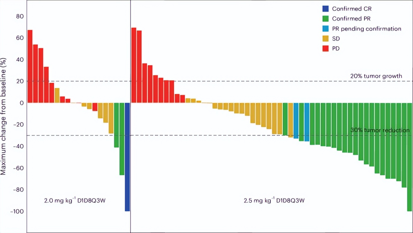2.0mg/kg和2.5mg/kg两剂量组间存在显著差异。在2.5mg/kg组的53例可评估患者中,cORR达39.6%,DCR 79.2%,mPFS 5.4个月,mOS 11.5个月;而2.0mg/kg组的20例可评估患者中,cORR仅为15.0%,DCR 50.0%,mPFS 2.7个月,mOS 5.6个月。值得注意的是,2.0mg/kg组患者基线治疗负担更重(45.5%接受≥3线治疗vs 2.5mg/kg组23.3%)。