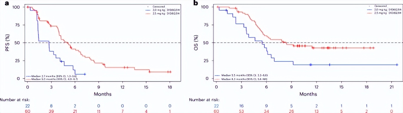 在2.0mg/kg组中,最常见的所有等级TRAE为贫血(86.4%)、白细胞减少和乏力(各45.5%)。≥3级TRAE发生率为45.5%,其中贫血为27.3%、淋巴细胞计数减少为13.6%、白细胞减少和中性粒细胞减少均为9.1%。