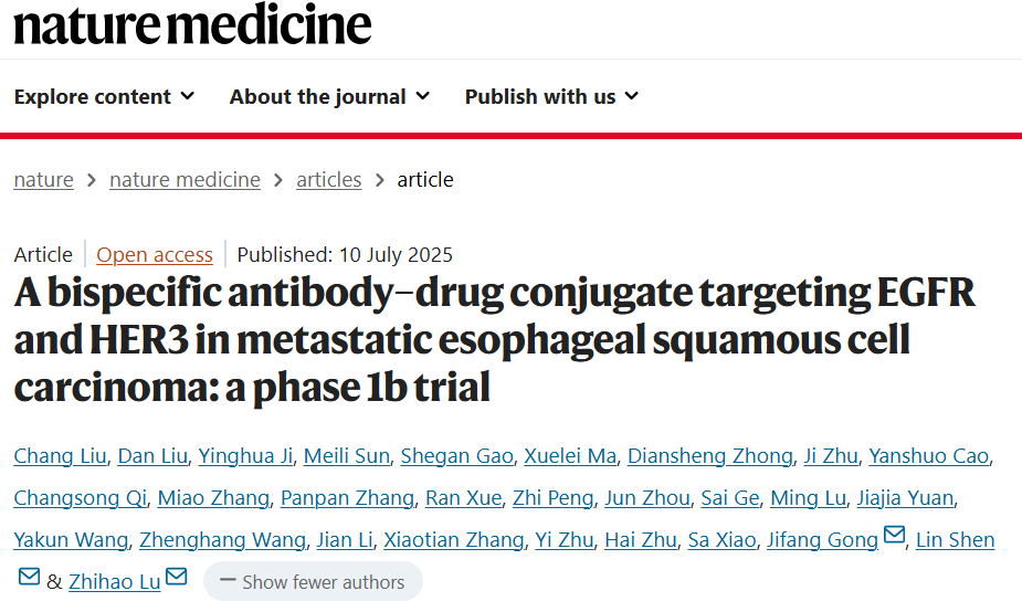 编者按:《自然-医学》(Nature Medicine,IF=50.0)于2025年7月10日在线发布了北京大学肿瘤医院沈琳教授团队牵头的“A bispecific antibody–drug conjugate targeting EGFR and HER3 in metastatic esophageal squamous cell carcinoma:a phase 1b trial”。该研究聚焦新型靶向EGFR和HER3的双靶点抗体-抗体偶联药物(ADC)BL-B01D1,初步验证了其在晚期食管鳞癌(ESCC)客观缓解率可达29.3%,安全性可控,具有良好的临床应用前景,为食管鳞癌患者提供了潜在的创新治疗方向。