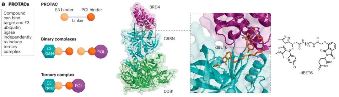 图3.PROTACs的机制示意图。PROTACs通过诱导或增强E3泛素连接酶与目标蛋白(POI)之间的相互作用,促进泛素转移和目标蛋白降解,它是异源双功能化合物,由两个分别结合E3连接酶和目标蛋白的配体组成,并通过一个化学连接体连接。例如,dBET6通过将BET蛋白BRD2–BRD4与CUL4–DDB1–CRBN E3连接酶复合体连接起来,从而降解这些蛋白。(图源:参考文献[1])