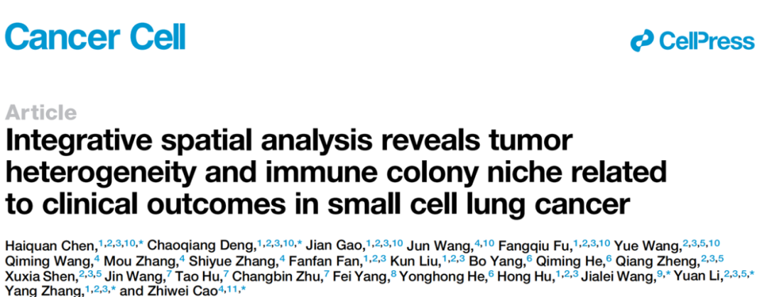 2025年3月,来自复旦大学附属肿瘤医院胸外科的陈海泉教授团队同复旦大学生命科学院曹志伟教授团队合作的一项重磅研究“Integrative Spatial Analysis Reveals Tumor Heterogeneity and Immune Colony Niche Related to Clinical-outcomes in Small Cell Lung Cancer”在Cancer Cell期刊(IF=48.8)发表。研究人员基于SCLC组织大样本队列(165例局限期经手术切除SCLC,23例广泛期SCLC接受免疫治疗前穿刺标本),综合运用空间单细胞蛋白组(CODEX)、单细胞空间转录组(CosMx SMI)和传统组学(WES、RNA-seq),对SCLC开展了精细的分子分型,全面绘制了SCLC免疫微环境空间图谱,为探索SCLC细胞异质性、空间特征、组织邻域结构及抗肿瘤免疫细胞互作提供了关键数据资源。