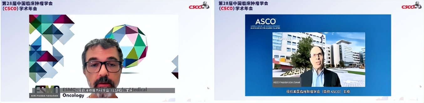 本次大会还收到了来自ESMO主席Fabrice André教授和ASCO主席Eric Small教授的视频贺词。两位国际肿瘤学领域的领军人物充分肯定了CSCO在国际肿瘤学界日益提升的影响力,并期待未来能开展更深层次的合作。他们表示,ASCO和ESMO将继续与CSCO保持密切合作,共同推动全球肿瘤防治事业的进步。
