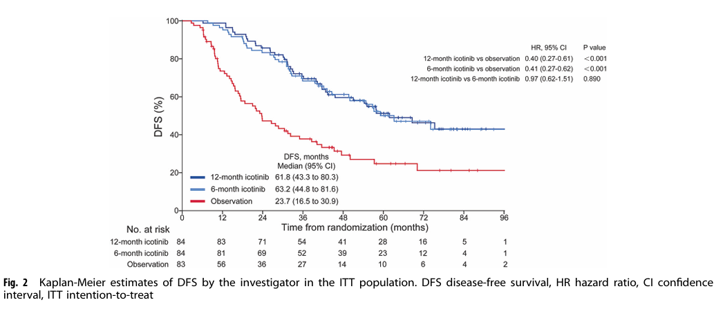 研究结果显示:1)无病生存期(DFS)显著改善:与观察组相比,埃克替尼治疗组(无论是12个月还是6个月)均显著延长DFS,12个月组中位DFS达到61.8个月,6个月组为63.2个月,远高于观察组的23.7个月,风险比(HR)分别为0.40和0.41,降低疾病复发或死亡风险近60%。