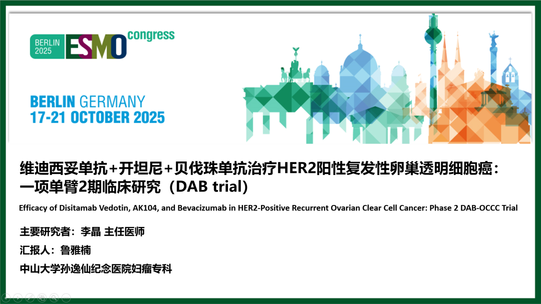 本届大会上,ADC药物在卵巢癌精准治疗领域探索进展迎来重要突破,来自中山大学孙逸仙纪念医院李晶教授团队发布的DAB-OCCC研究备受关注,是本年度ESMO大会唯一一项针对复发性卵巢透明细胞癌的药物治疗研究。该研究探索了国创ADC药物维迪西妥单抗联合卡度尼利单抗与贝伐珠单抗,在HER2阳性复发性OCCC患者中的疗效与安全性。《肿瘤瞭望》特邀李晶教授深入解读该研究进展,并邀请重庆大学附属肿瘤医院周琦教授进行专业点评,以期为临床实践提供更多循证参考。