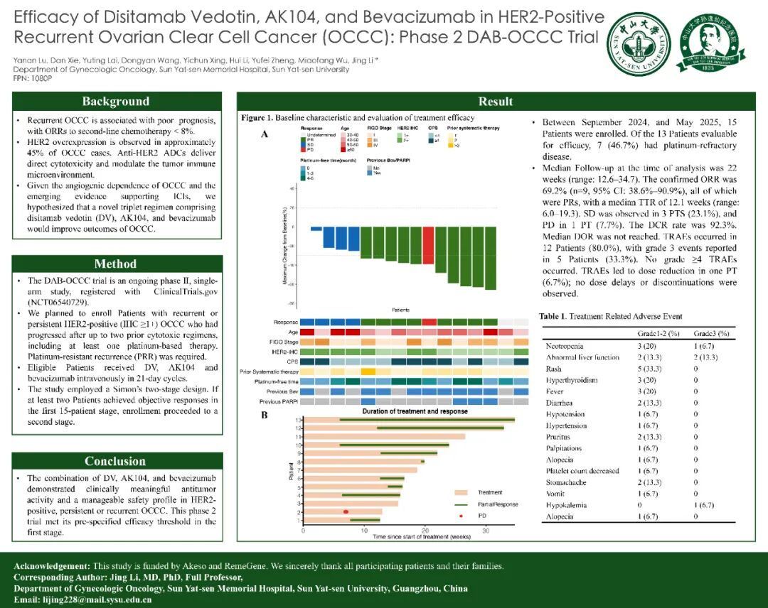 《肿瘤瞭望》:在2025年ESMO年会上,您的团队一项DAB-OCCC研究结果入选,该研究旨在探索“靶向HER2 ADC药物维迪西妥单抗联合卡度尼利单抗(AK104)及贝伐珠单抗”治疗HER2阳性复发性OCCC的疗效。请您解读下该项研究的研究背景及主要研究成果?