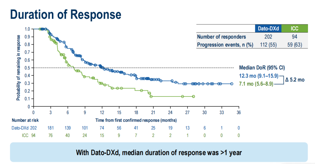 相较于ICC组,Dato-DXd组经证实的ORR是ICC组的2倍以上(62.5%vs29.3%),经证实的完全缓解率是ICC组的3倍以上(9.0%vs 2.5%)。使用Dato-DXd治疗的患者,中位缓解持续时间>1年(12.3个月vs7.1个月)。