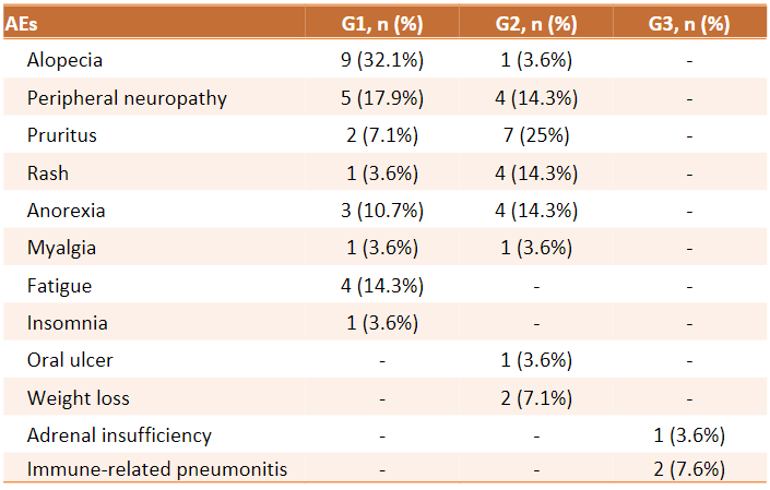 安全性:1级治疗相关不良事件(&gt;10%)包括脱发(n=9,32.1%)、手足麻木(n=5,17.9%)、乏力(n=4,14.3%)和食欲不振(n=3,10.7%)。2级治疗相关不良事件(&gt;10%)包括瘙痒(n=7,25.0%)、皮疹(n=4,14.3%)、食欲减退(n=4,14.3%)和手足麻木(n=4,14.3%)。