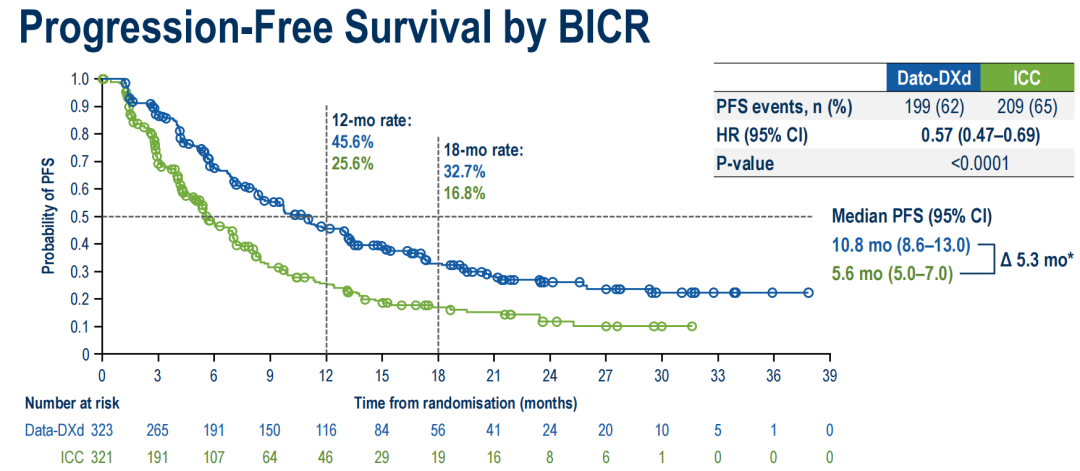 TB-02研究的中位随访时间为27.5个月,Dato-DXd组由BICR评估的中位PFS为10.8个月,相较于化疗组(5.6个月)呈翻倍延长,绝对获益达到了5.3个月,疾病进展或死亡风险显著降低43%(HR 0.57,95%CI:0.47–0.69,P<0.0001);而研究者评估的PFS也显示一致的获益(9.6 vs 5.2个月,HR 0.56,95%CI:0.47–0.67)。