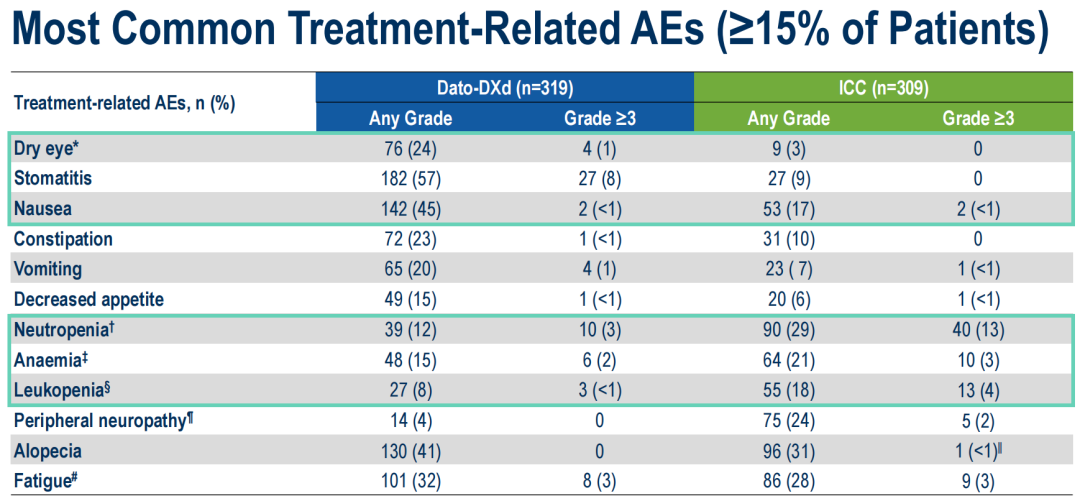 Dato-DXd的常见≥3级TRAEs多为个案,发生率低于化疗