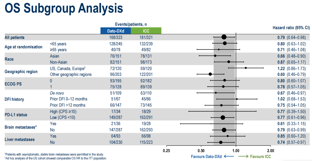 最引人关注的是OS,Dato-DXd组的中位OS达23.7个月,相较于对照组(18.7个月)延长5个月,死亡风险显著降低21%(HR 0.79,95%CI:0.64–0.98,P=0.0291)。ASCENT-03研究中位随访13.2个月,OS尚未成熟(目前HR 0.98,95%CI:0.75–1.30)。由此可见,TB-02研究中PFS和OS都达到了有显著统计学意义和临床意义的改善,Dato-DXd相较于单纯化疗有非常显著的生存获益。再者,总体上不同亚组的生存获益一致,尤其对于难治性的脑转移患者,PFS HR和OS HR分别低至0.39和0.61。