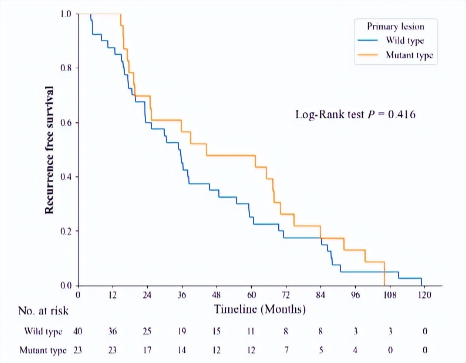 而后通过补充了一部分符合入组标准的样本,扩大了筛选期限(2012年11月至2025年5月),最终纳入的63例患者,在不同复发转移灶与原发病灶的突变一致性方面,淋巴结转移灶的一致率为93.1%(Cohen’s kappa=0.854),胸壁转移灶的一致率是90.0%(Cohen’s kappa=0.754)。在具有淋巴结标本的17例患者中,原发灶与淋巴结的PIK3CA突变一致率为88.2%,淋巴结与复发转移灶的一致率为100.0%,原发灶、淋巴结与复发转移灶三者的一致率为88.2%。预后分析显示,原发灶PIK3CA突变和野生型的患者中位无复发生存期分别为44.5个月和35.2个月(Log-rank P>0.05)。