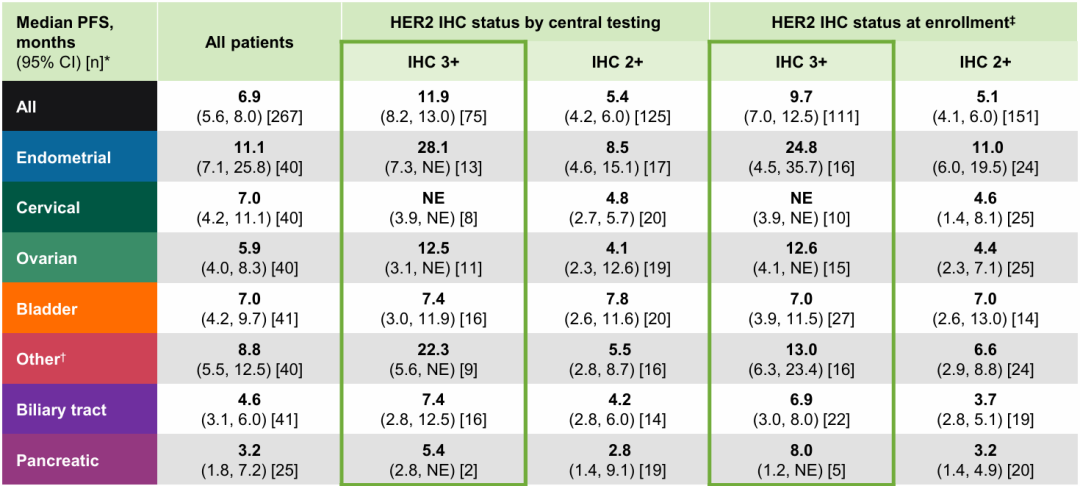 在次要终点方面,整体人群的中位PFS为6.9个月,与既往报道一致。随着随访时间延长,整体人群中的HER2 IHC 3+患者(中心实验室检测)的中位PFS更长,达到11.9个月[1]
