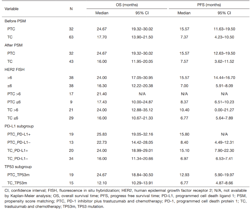表1.HER2阳性胃癌患者的OS和PFS