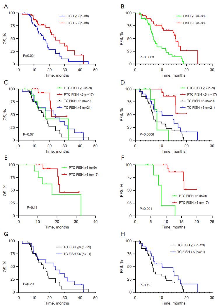 研究发现,在所有HER2阳性胃癌患者中,HER2-FISH拷贝数>6的患者,其OS和PFS均显著优于FISH≤6的患者(中位OS:24.00个月vs.16.30个月;中位PFS:15.57个月vs.7.00个月)。更重要的是,在PTC组中,HER2-FISH>6的患者PFS获益尤为显著(未达到中位PFS vs.8.4个月),而在TC组中则未见显著差异(图3)。提示HER2高扩增患者可能从PD-1抑制剂联合治疗中获益更多。