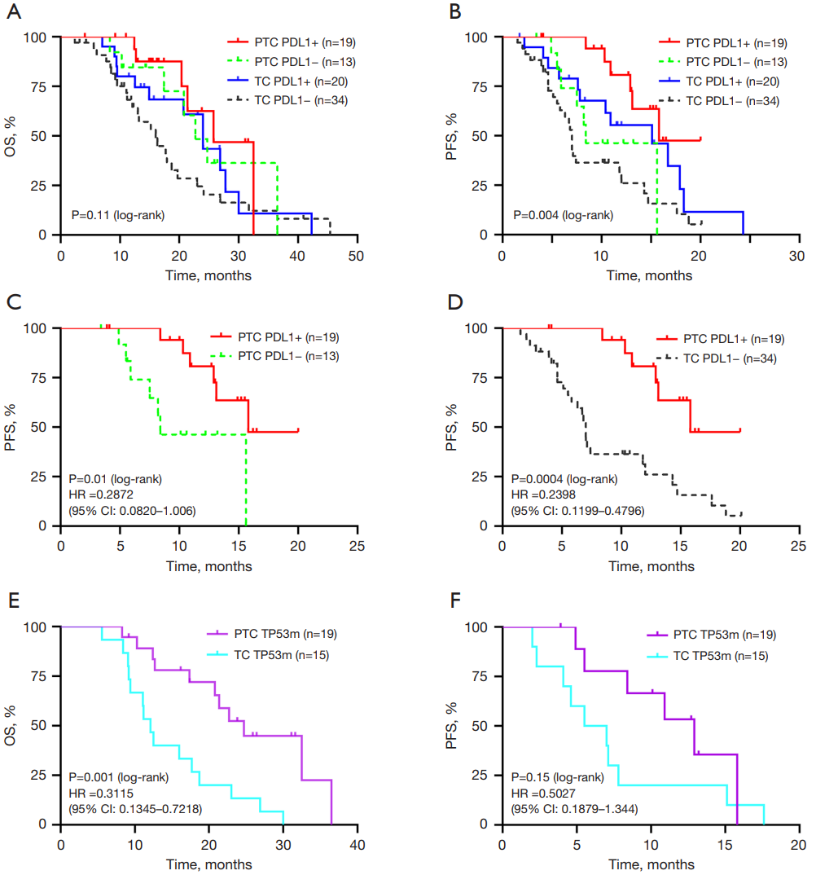 通过NGS检测发现,TP53是HER2阳性胃癌中最常见的突变基因。在PTC组中19例、TC组中15例患者携带TP53突变。分析显示,TP53突变患者中,PTC组的中位OS显著优于TC组(24.67个月vs.12.10个月),中位PFS也有延长趋势(12.93个月vs.6.77个月)(图4,表1)。这表明,TP53突变可能是HER2阳性胃癌患者从PD-1抑制剂联合治疗中获益的重要分子标志。