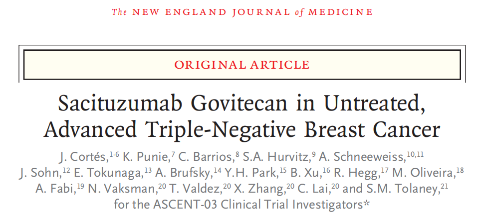 [4]Cortés J,Punie K,Barrios C,et al.Sacituzumab Govitecan in Untreated,Advanced Triple-Negative Breast Cancer.N Engl J Med.Published online October 19,2025.doi:10.1056/NEJMoa2511734